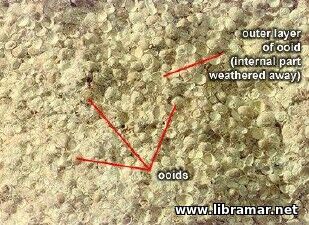 Oolitic limestone is composed largely of the rounded sand like grains of calcite known as ooliths, formed by the accretion of layers of calcium carbonate on smaller particles, like scale in a boiler. A cross section of an oolith reveals an internal structure much like that of a hailstone.
